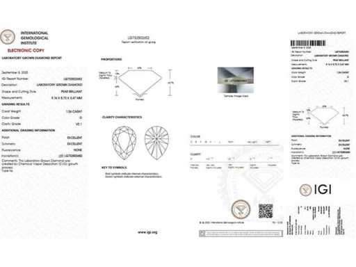 Questo diamante coltivato in laboratorio è dotato di un certificato ufficiale IGI e di un rapporto che garantisce la qualità del diamante. Consulta il certificato mostrato nelle foto o consulta la tabella sopra per le specifiche dettagliate dei diamanti. Tutte le caratteristiche menzionate sono state tratte direttamente dal rapporto IGI allegato.