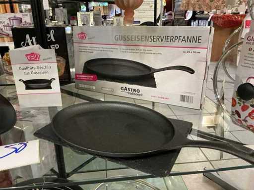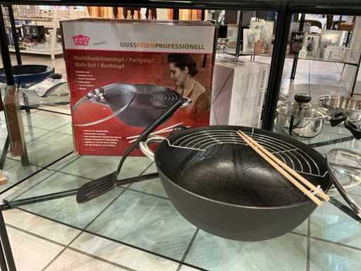 Penzola rotonda con coperchio, wok con accessori e teglia con sottotibri, tutto in ghisa