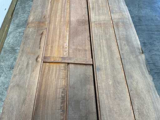 Piantate in lamiera Azobé in legno duro con dimensioni di 250 x 20 x 3 cm. Con una larghezza di lavoro di 18,5 centimetri. La specie legnosa ha un colore rosso a marrone cioccolato ed è relativamente pesante.