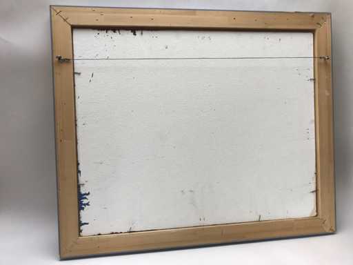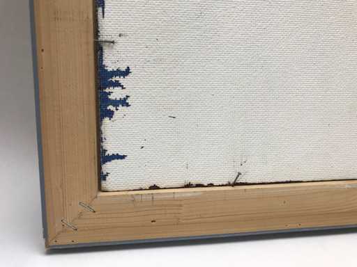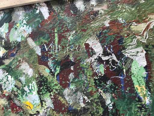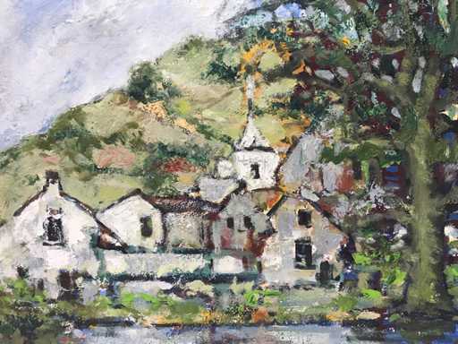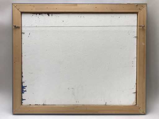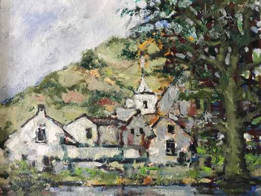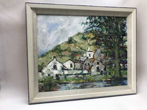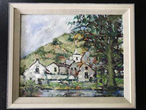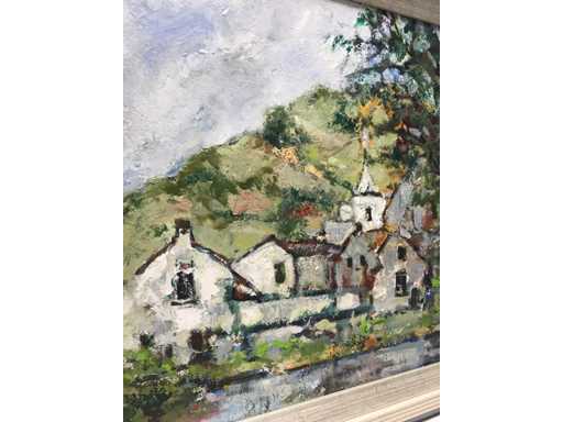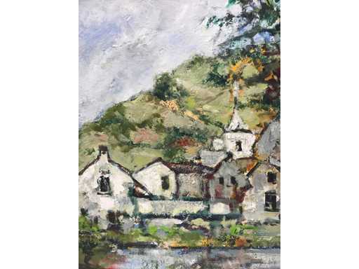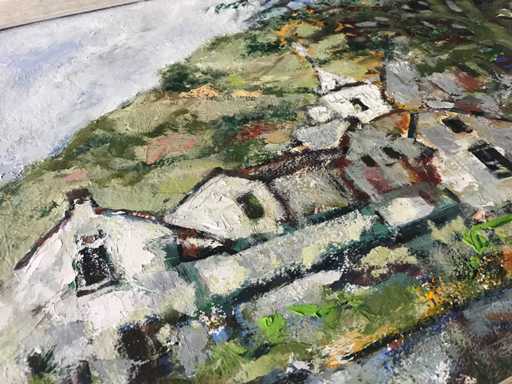 Olio su tela. Astratto. Villaggio tra le colline. Afm. 58cm x 48cm x 4,5cm. Firmato in alto a destra.