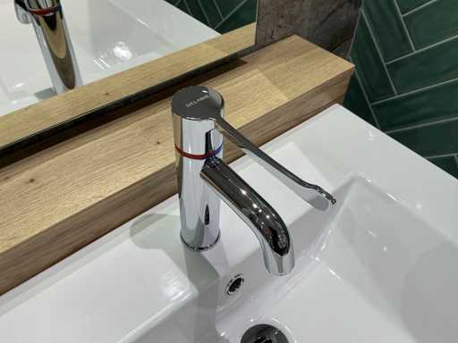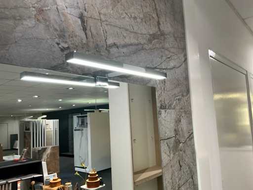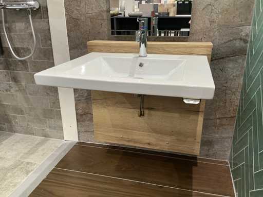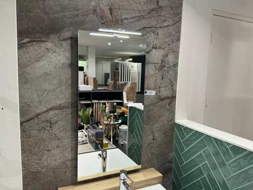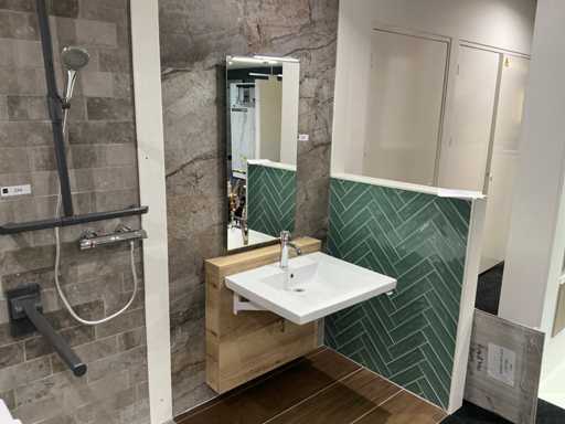 Composto da Mirror 100x50, lavandino in ceramica 70x57, rivestimento in mobile Halifax (quercia m17) inclusi 2 supporti superiori, sifone e connessioni, lampada con inverter, rubinetto miscelatore per dissipatore termico Delabie Securitherm.