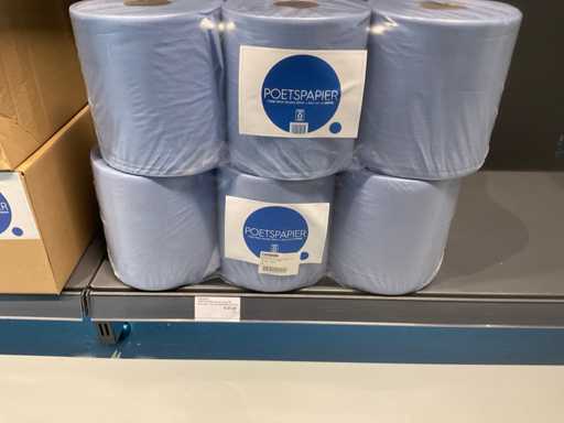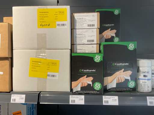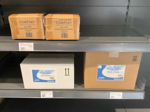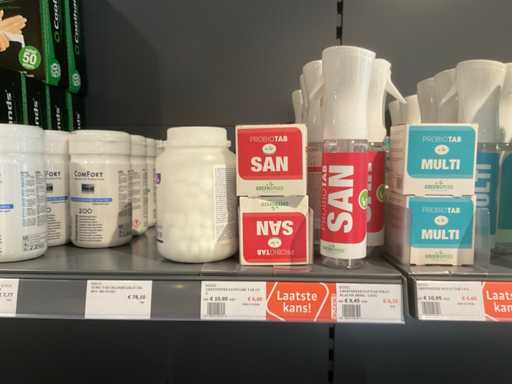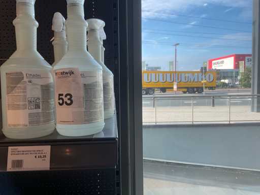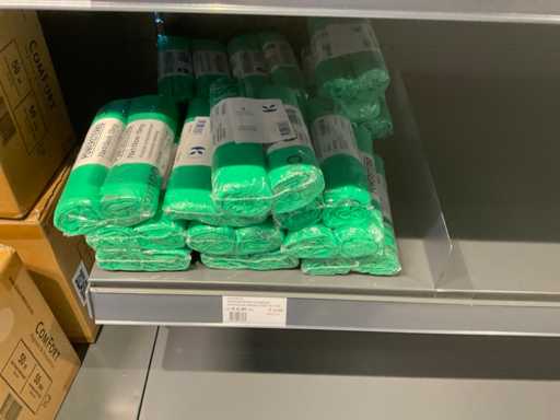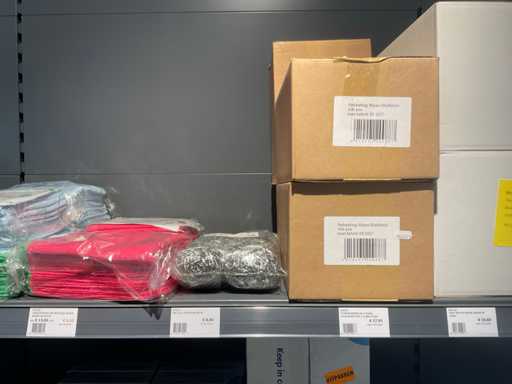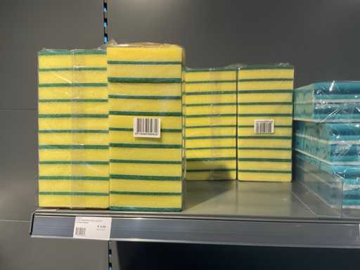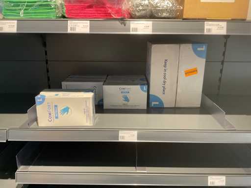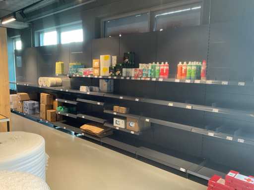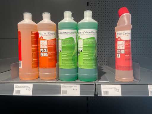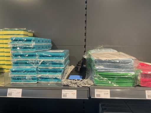 Vari prodotti per la pulizia nello scaffale del negozio, escluso lo scaffale composto da spray disinfettante, detersivo per piatti, detergente per la cucina, salviette per le mani, panni, spugne, sacchetti, cerotti, sapone.