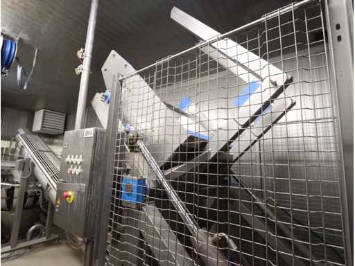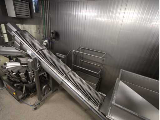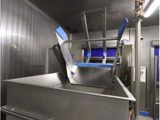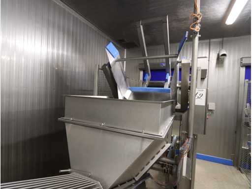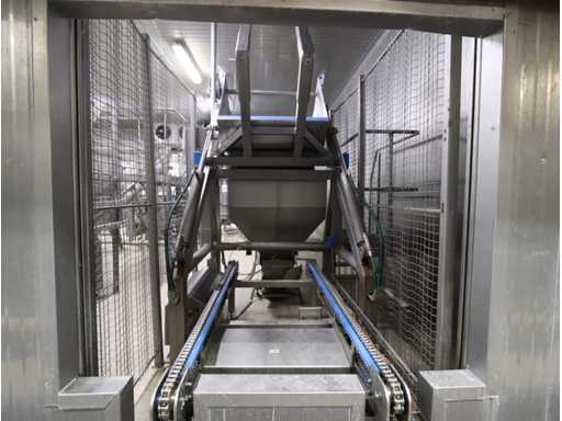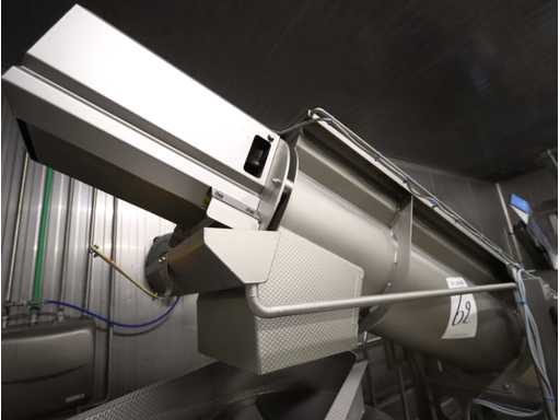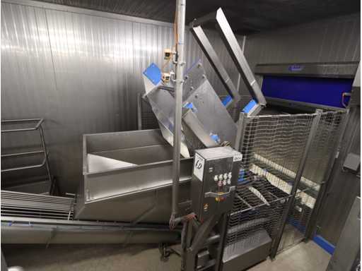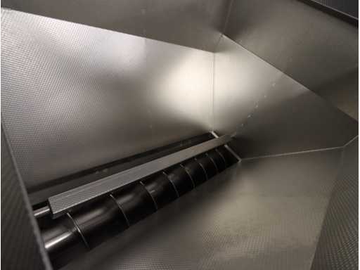 Dotato di nastro trasportatore a catena di ingresso, larghezza binario 850 mm, lunghezza 2000 mm, compreso nastro trasportatore a vite elevatore con tramoggia ricevente, vite Ø 400 mm, lunghezza della vite 4500 mm, altezza uscita 1700 mm, bunker per apertura in presa circa 1100x1300 mm, senza piattaforma e scale
