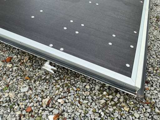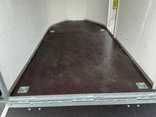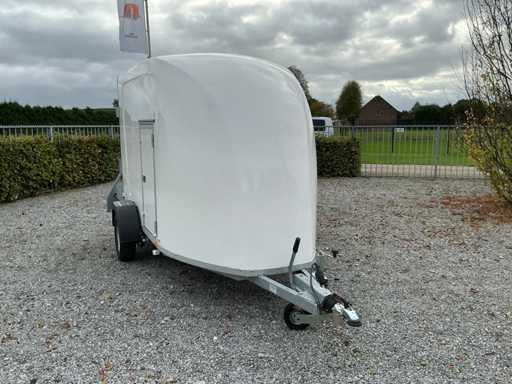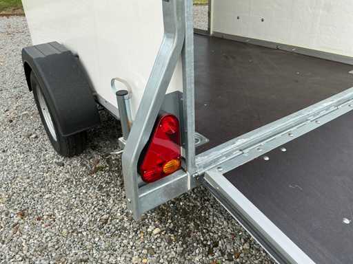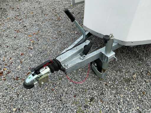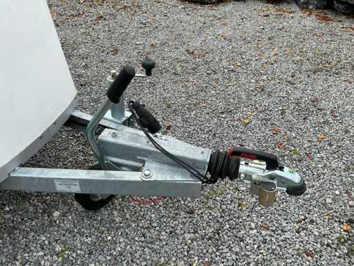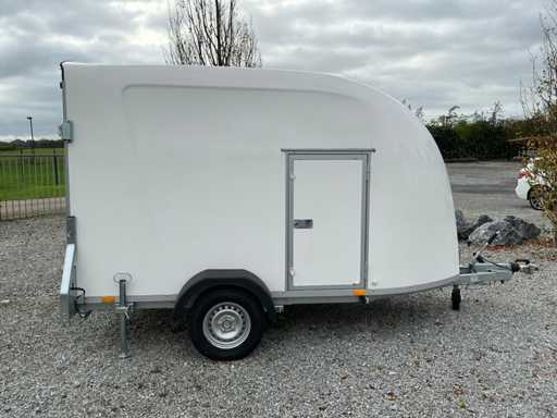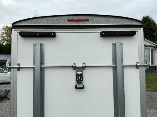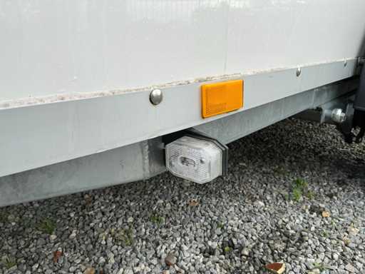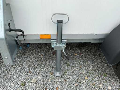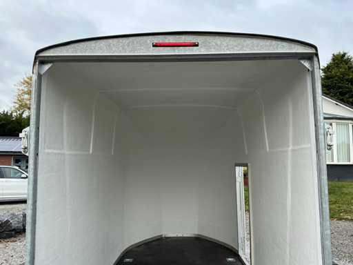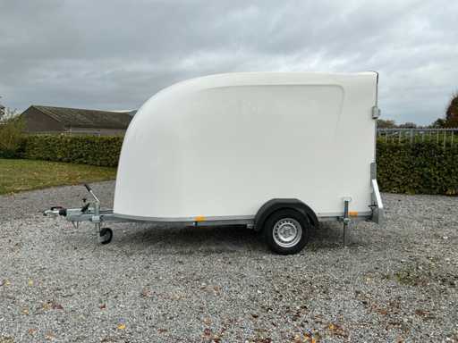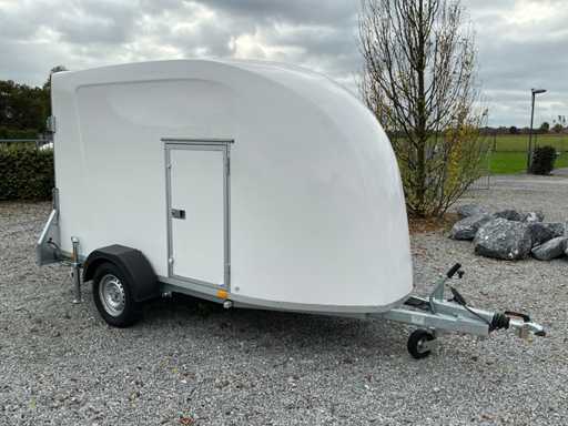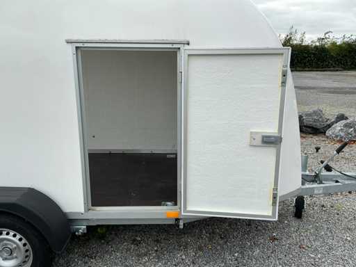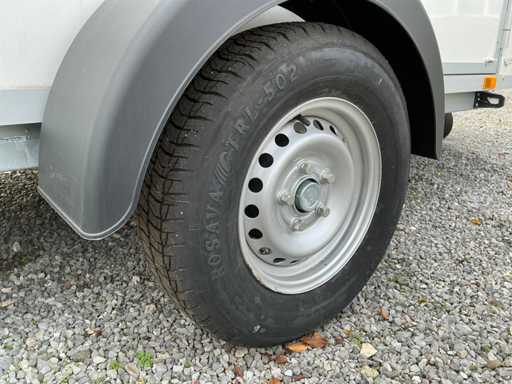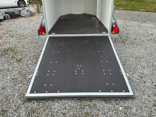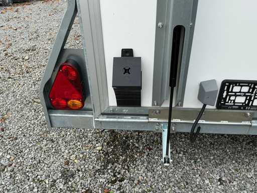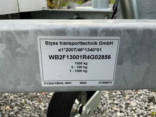 Equipaggiato con: Rimorchio chiuso Blyss, modello NIKI, Peso lordo 1300 kg (790 kg netti), Colore bianco, portellone posteriore discendente e una porta laterale, asse singolo frenato, pneumatici 165R13, pavimento in legno compensato, 4 punti di ancoraggio incassati nel pianale di carico, acciaio saldato, completamente zincato a caldo, impianto elettrico: 13 poli, 12V, produttore dell'asse: AL-KO, assale frenato freno a repulsione, ruotino d'appoggio, illuminazione, illuminazione della larghezza, luce di stop integrata sopra i supporti posteriori del portellone sinistro e destro, Portellone carrabile, portellone posteriore a doppia molla a gas, dimensioni apertura di carico: circa 149 x 172 cm, dimensioni porta laterale: circa 60 x 108 cm, dimensioni interne L: 339 cm, L: 151 cm, A: 185 cm, dimensioni esterne circa L: 468 cm, L: 202 cm, A: 235 cm.