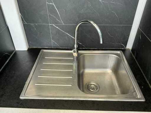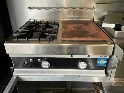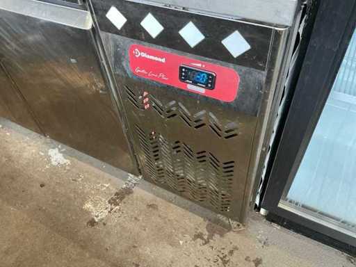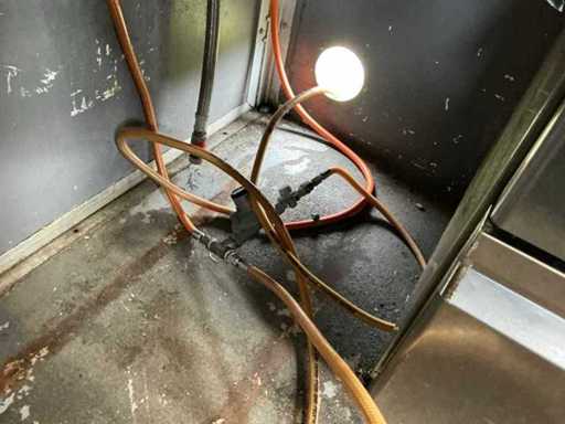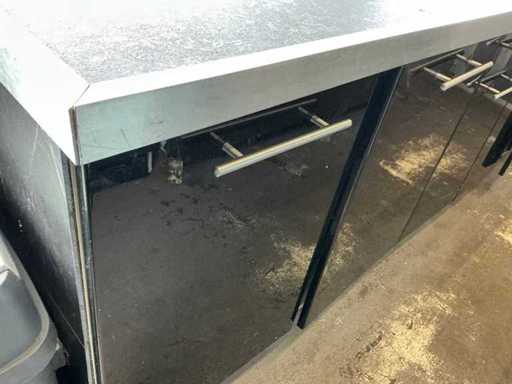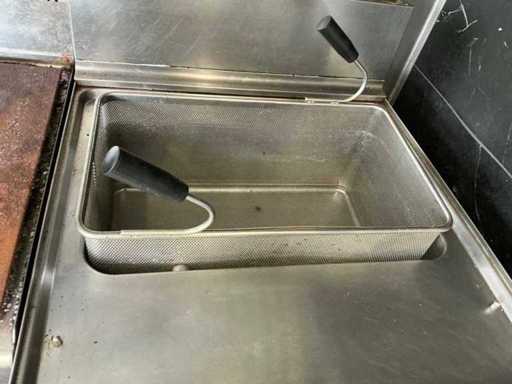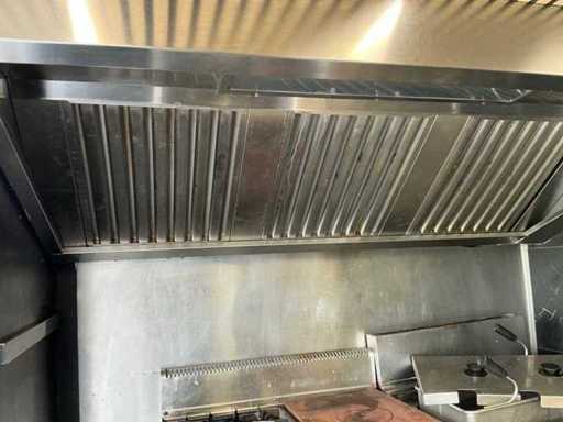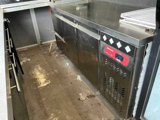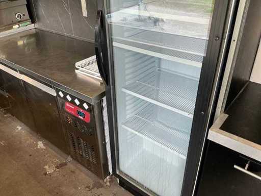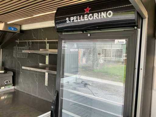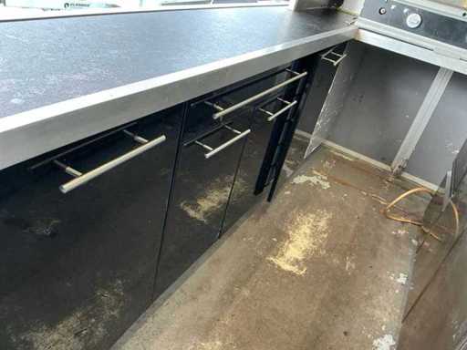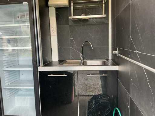 - Dotato di: fornello a gas, cucina per pasta, cappa di estrazione, banco da lavoro refrigerato con 2 porte e 2 cassetti, frigorifero espositivo, lavandino, armadietti.