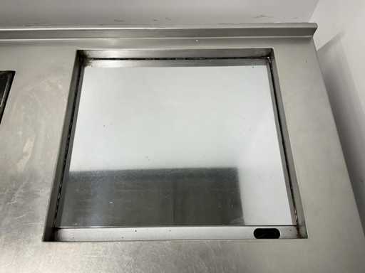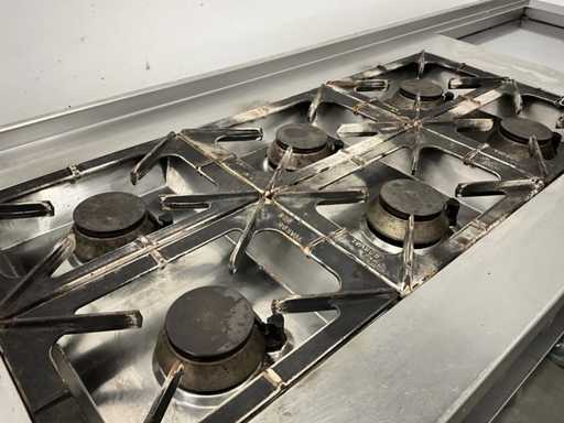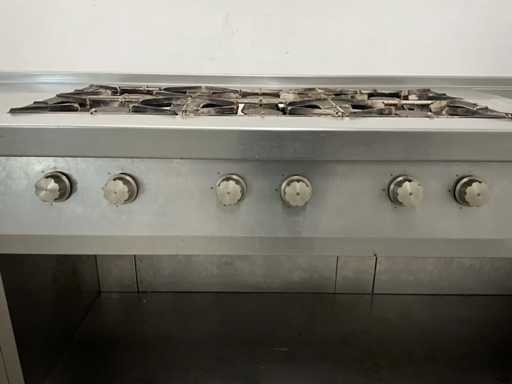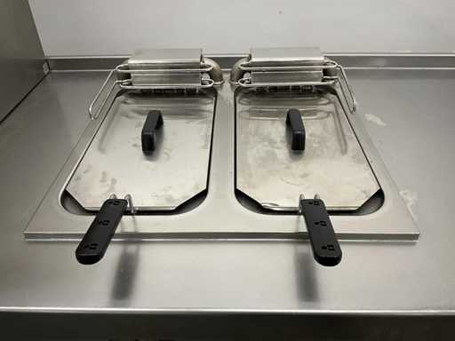 Dotato di doppia friggitrice, armadio scaldavivande, fornello a gas a 6 fuochi, teglia e lavello.