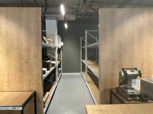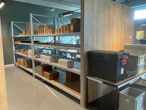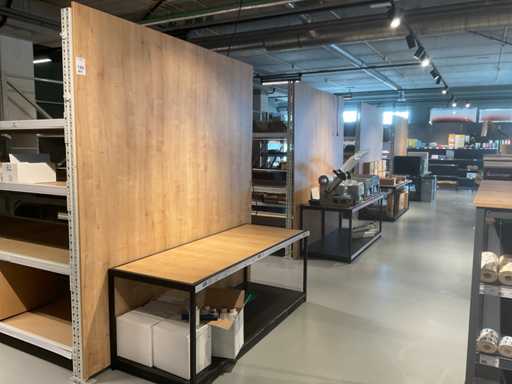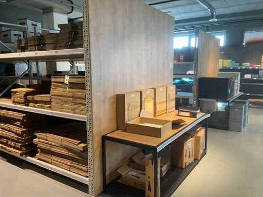 4 scaffalature portapallet a doppia falda con parete frontale e tavolo in legno, dimensioni circa 200x75x77 cm