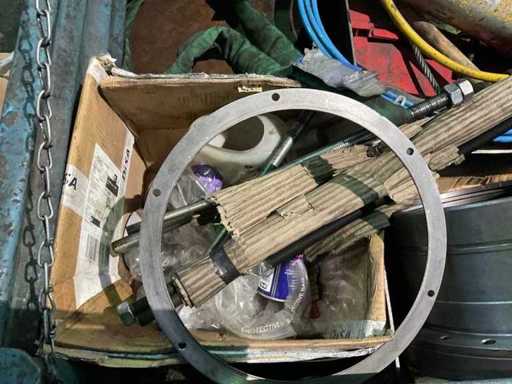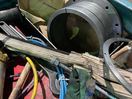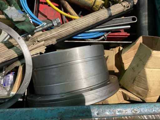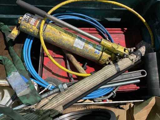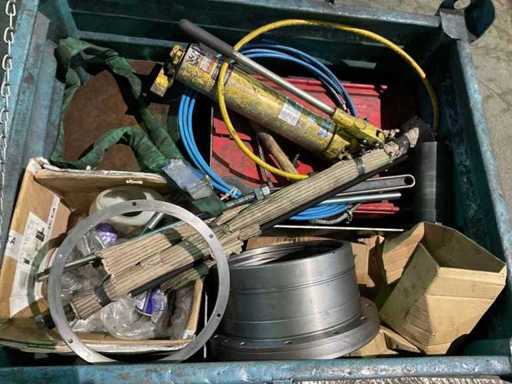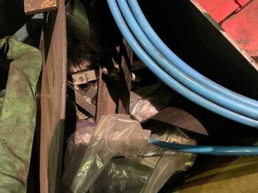 Scatola metallica con coperchio contenente utensili, parti di macchina, cinghie di sollevamento, ecc.