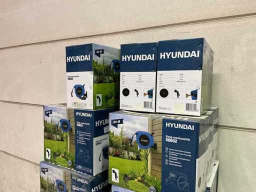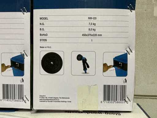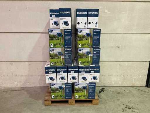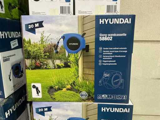 • Il tubo da giardino si ritrae automaticamente dopo l'uso. Puoi rimuovere la scatola da muro dalla staffa e quindi conservarla facilmente senza brina e sicura. Come sei abituato da Hyundai, il design nero/blu è elegante e moderno. Una risorsa per il tuo giardino.