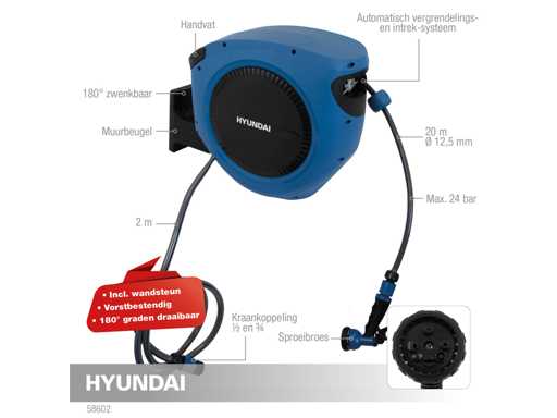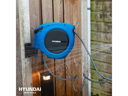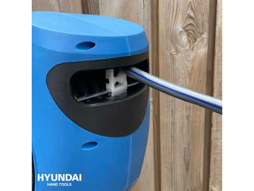 • Il tubo da giardino si ritrae automaticamente dopo l'uso. Puoi rimuovere la scatola da muro dalla staffa e quindi conservarla facilmente senza brina e sicura. Come sei abituato da Hyundai, il design nero/blu è elegante e moderno. Una risorsa per il tuo giardino.
