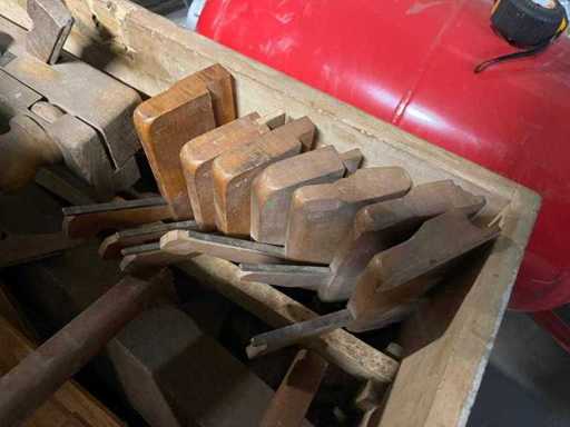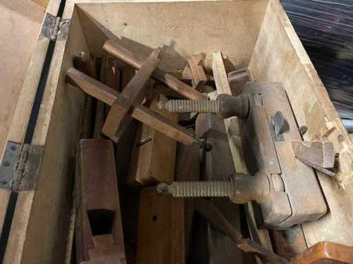 Lavorazione del legno. La scatola contiene un mix di lime, scalpelli, pialleine, martelli e