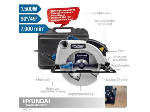 • Scopri la precisione della sega circolare HYUNDAI con una potente potenza di 1.500 W. Questa segatrice professionale è dotata di una comoda funzione laser, che permette di tagliare perfettamente dritto. La linea di taglio è proiettata con precisione sul pezzo, così ottieni sempre il risultato desiderato. • Con un diametro massimo di taglio di 185 mm (inclusa la lama della sega inclusa) e un foro di 20 mm, questa sega circolare è adatta a una vasta gamma di applicazioni di taglio. Che tu voglia tagliare legno, materiale in lamiera o altri materiali, questa macchina è pronta per te. • Collegamento aspirapolvere • Angolo di ingombro a ingombro a variazione infinita • Include lama da sega da 185 mm per legno - Modello: 56215 - EAN: 8718502562156 - Tensione di rete: 230 V - Frequenza di rete: 50 Hz - Potenza: 1.500 W - Velocità: 6.000 min-1 - Diametro della lama della sega: 185 mm - Lama della sega velocistica nominale minima: 7.000 min-1 - Spessore massimo della lama della sega: 1,6 mm - Spessore minimo del dente: 2,2 mm - Diametro del foro dell'asse: 20 mm - Profondità di taglio a 90°: 64 mm - Profondità di taglio a 45°: 48 mm - Angolo di ingentro: 0 - 45° - Classe di protezione IEC: II - Lunghezza corda: 2 m - Rumore LpA: 89,7 dB(A) - Peso: 4,24 kg Laser - Tensione: 3 V - Lunghezza d'onda 650 nm - Classe laser 2 - Classe di protezione IEC III Nel pacchetto; - Sega circolare Hyundai 1.500 Watt con funzione laser - Lama per sega 185 mm -Chiave - Connessione universale per aspirapolvere -Manuale