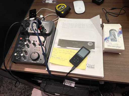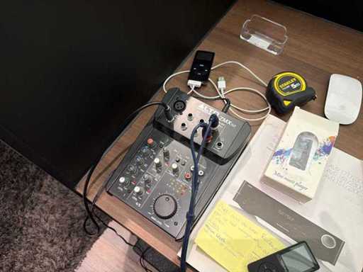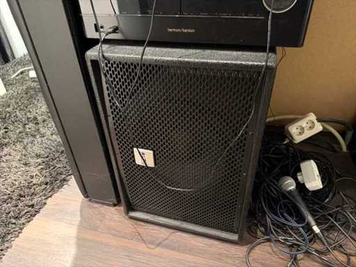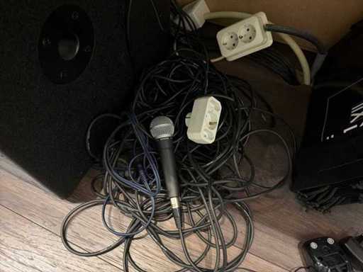 Set audio con mixer alto, amplificatore Harman/Kardon, altoparlante e Shure SM58
