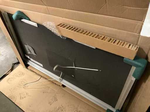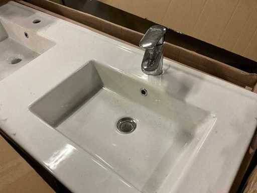 Composto da un mobile base, 120cm, 2 cassetti + doppio lavabo in ceramica 122x47cm con 1 rubinetto miscelatore hansgrohe + specchio 120x60cm