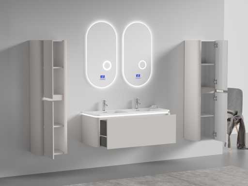 Tipo: BOSTON1202-TA. Dimensioni Set completo: 1* Unità da lavabo - 1200x455x400mm, 1* Doppio lavandino - 1205x460x190mm, 2* Armadio laterale - 1500x350x350mm, 2* Specchio - 450x900mm. Equipaggiato con: illuminazione LED nel mobile base - 2 rubinetti inclusi scarico a scarico - 1 cassetto con 2 compartimenti di stoccaggio - Sistema di cassetti a chiusura soft - Specchi LED con sistema antiappannamento - Armadietti laterali e mobili con lavabo preassemblati.