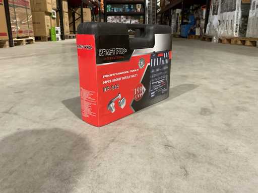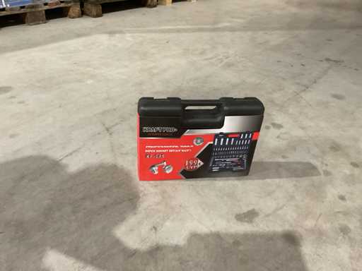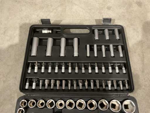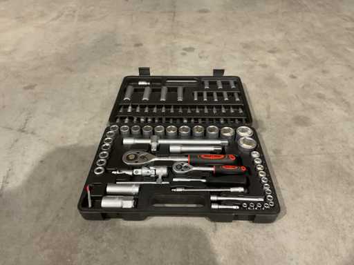 Equipaggiato con un adattatore Bit 1 pezzo; 4 pezzi di tappo profondo 1/2"; 8 pezzi di tappo profondo 1/4"; 17 pezzi di tappo chiave inglese da 1/4"; 16 pezzi bit; 18 pezzi di prese da 1/2"; 13 pezzi di prese da 1/4"; 2 pezzi di barra a T scorrevole; 1 pezzo di estensione da 1/2"; manico a cricchetto a 2 pezzi; 2 pezzi di giunzione universale; 2 pezzi di tappi candele; 2 pezzi di prese da 1/4"; manico driver a bit 1 pezzo; 1 pezzo di asta di estensione morbida da 1/4'; 3 pezzi di chiavi Allen; Non utilizzato in scatola (Dimensioni di trasporto 380 x 80 x 280, Peso 6,26 KG)