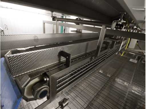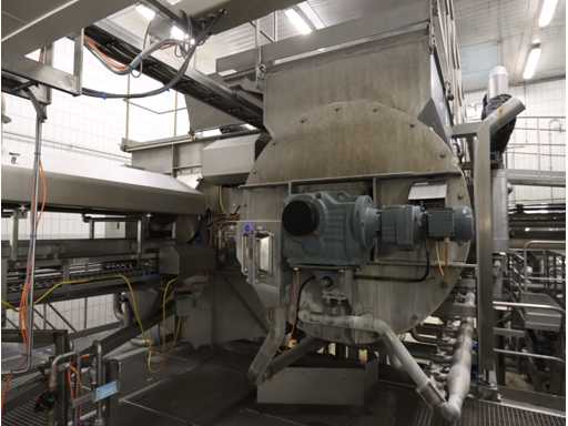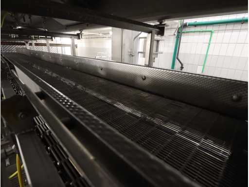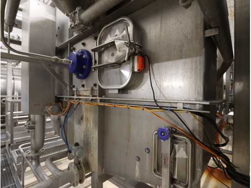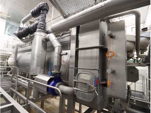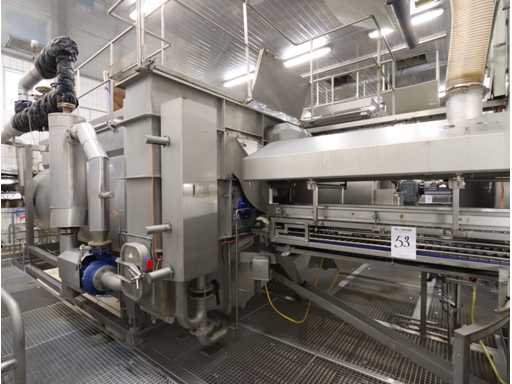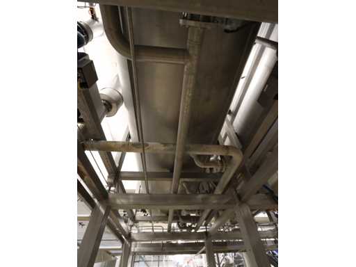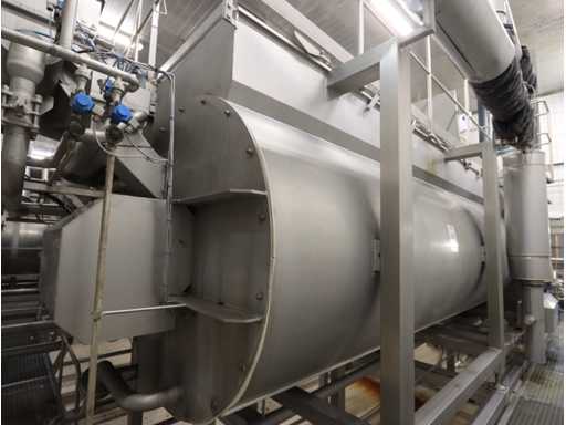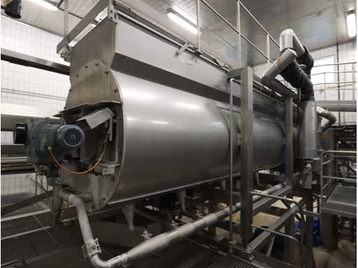 Riscaldato a vapore, pressione di lavoro 6 bar, vite Ø circa 1200x5000 mm, contenuto d'acqua 1x 4,41 M3, 1x 3,39 m3, dotato di nastro trasportatore in acciaio inossidabile, dimensione 4800x500 mm, superficie utilizzata 8500x4300 mm, senza pianerottolo, scale e pavimento a griglia