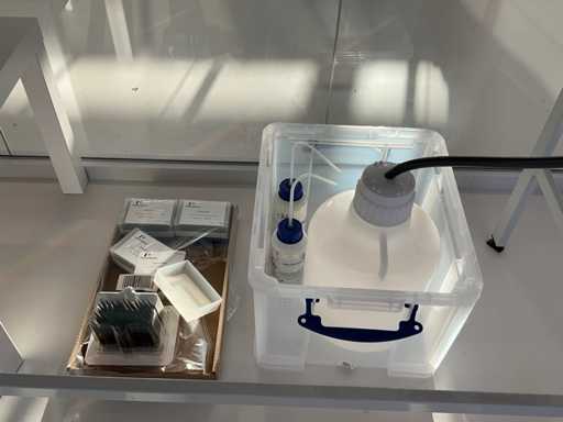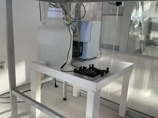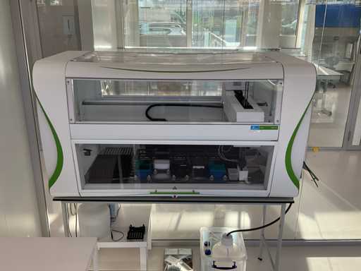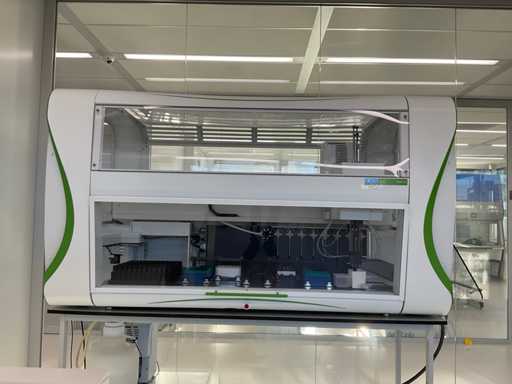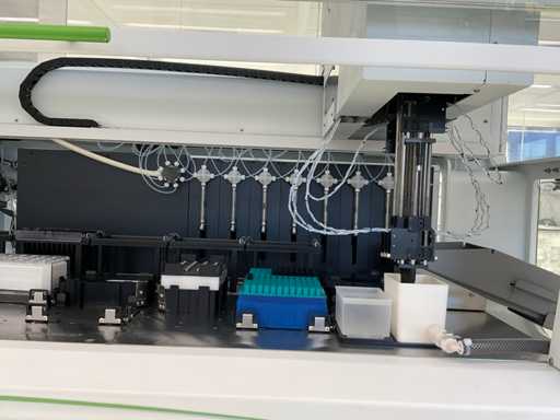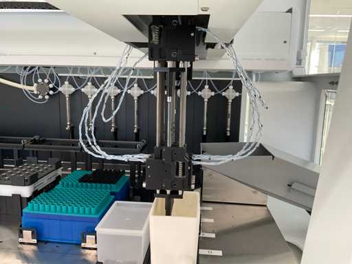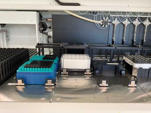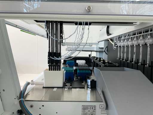 Postazione automatica; dotato di braccio Varispan flessibile a 8 punte; inclusa l'unità di pompa peristaltica "Perkin Elmer"; varie micropiastre; tavolo da lavoro e accessori; inclusi pallet (2x) con punte per postazioni di lavoro