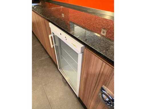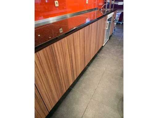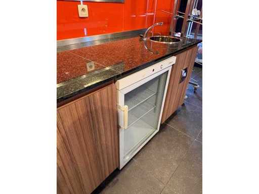 Cabinets with integrated sink with knee control and granite worktop, incl. drinks fridge. Material on top not included in lot.