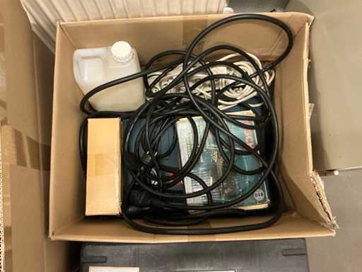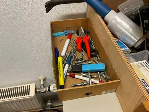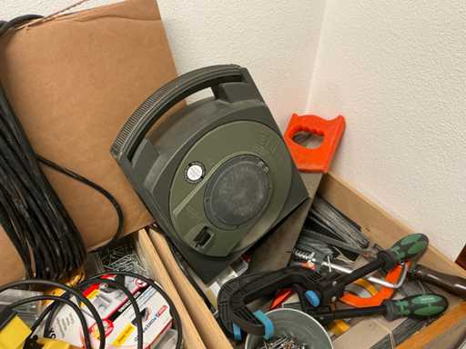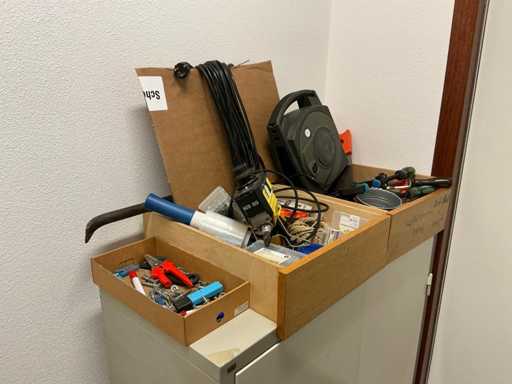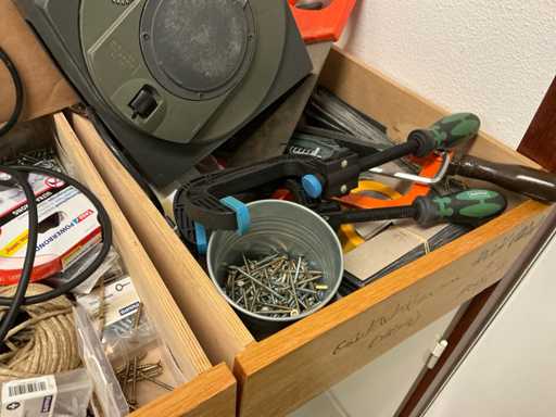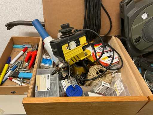 Vari attrezzi, trapani, custodie, scatole ecc. Include un archivio con contenuti