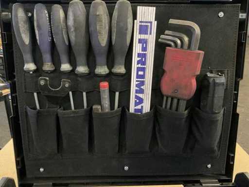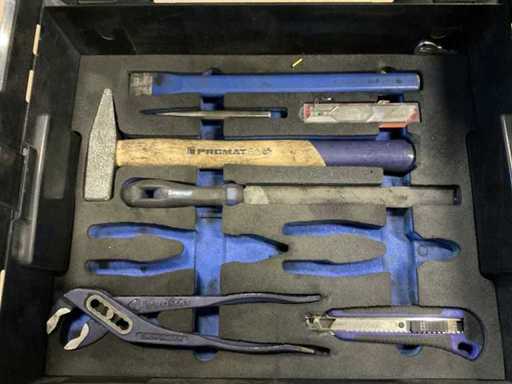 Set di attrezzi in sistema Sortimo, composto da cacciaviti, chiavi ad anello a cricchetto, chiavi a perno, martello ecc.