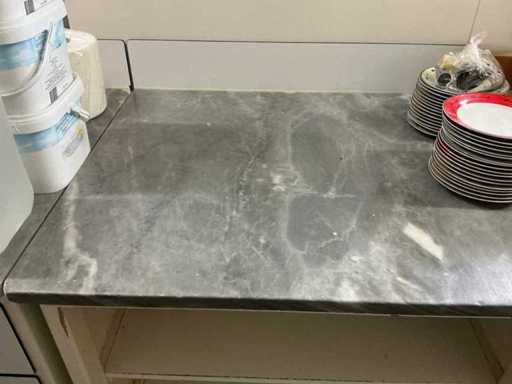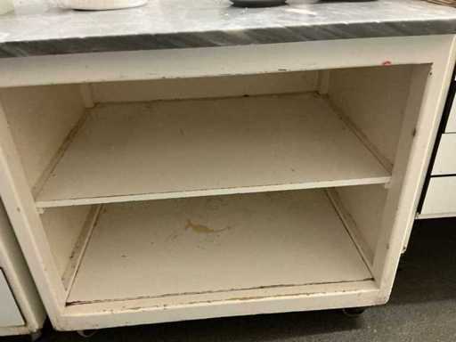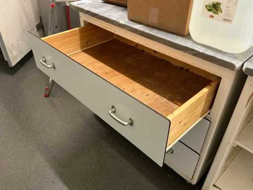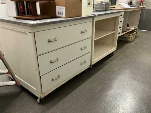 Mobile; base di legno; dotato di sommità in pietra naturale; 1 mobile con 3 cassetti; 1x armadietto con 2 cassetti, 5x teglia da forno; Gli oggetti sul tavolo non fanno parte del lotto.