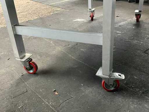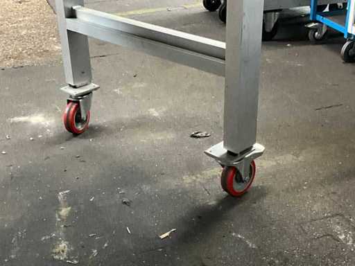 mobile; dotato di 4 ruote giretrici; telaio in alluminio; piano del tavolo in compensato;