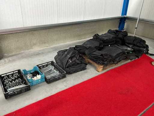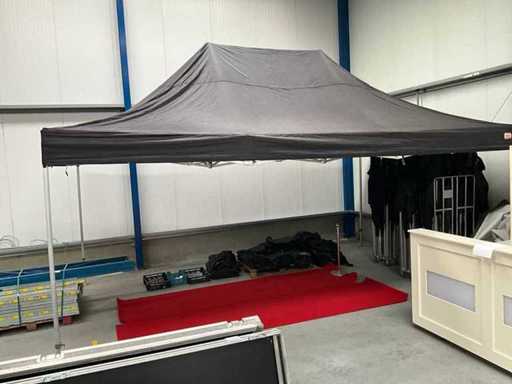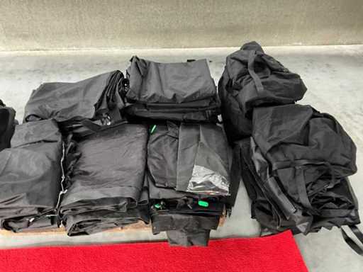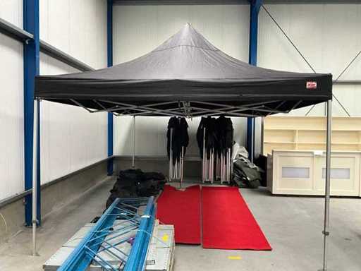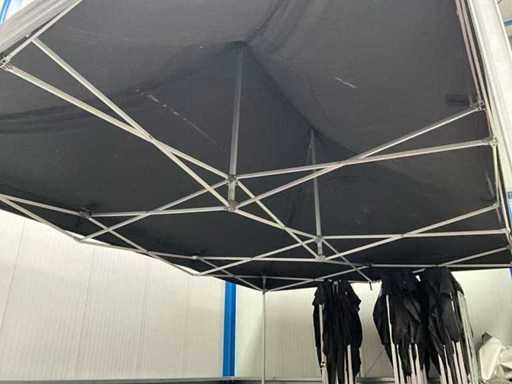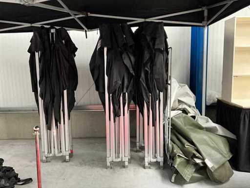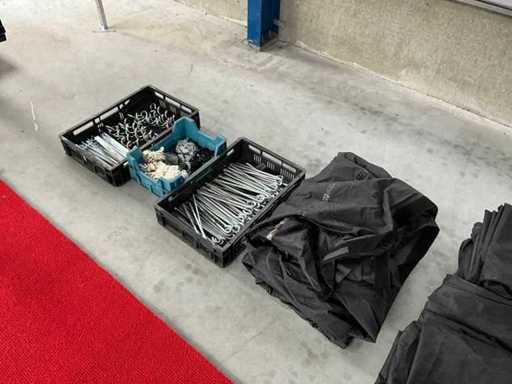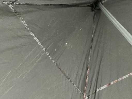 Composto da: 1x telaio 400x400 cm, 1x telone per tetto, copertura tenda, 2x telone laterale, 1x telone laterale con porta, 1x telone laterale con finestra, 2x sacchetto per teli laterali, 4x perni antitempesta, 10 pennini per piodi.