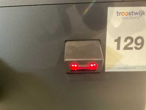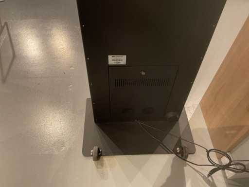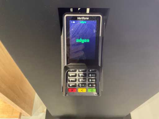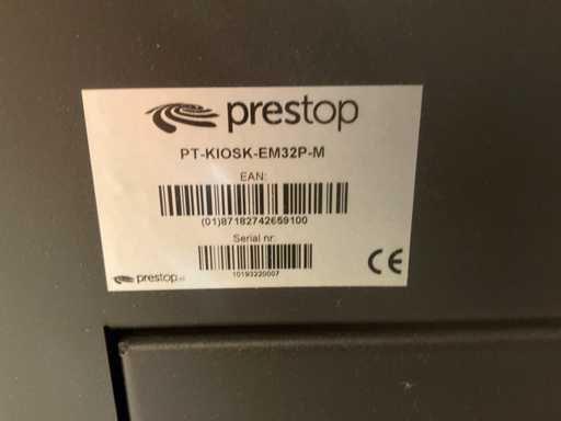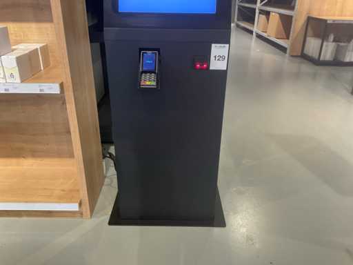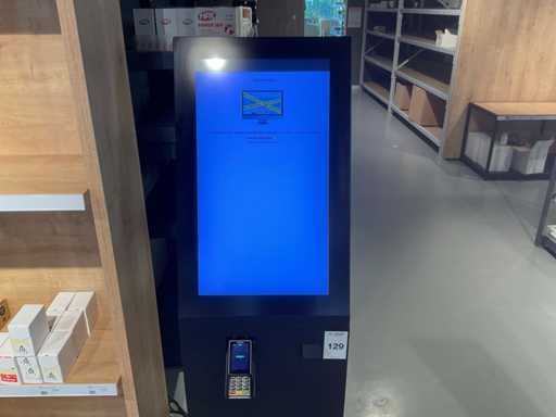 Display in metallo con touchscreen diagonale da 80 cm, bancomat Verifone, scanner e 2 ruote per la movimentazione, esclusa la chiave.