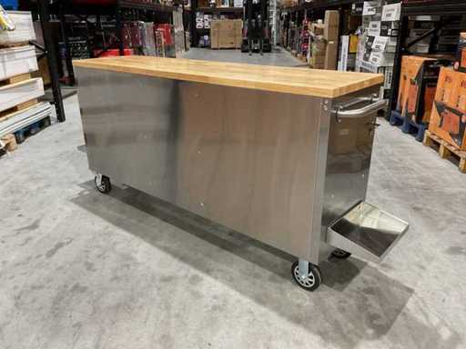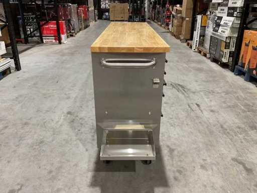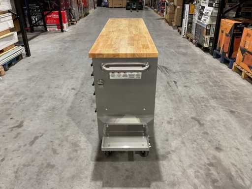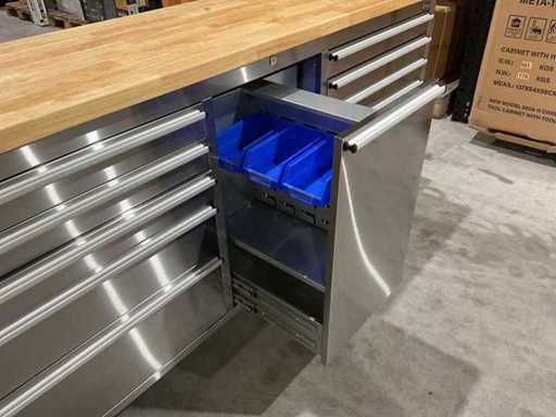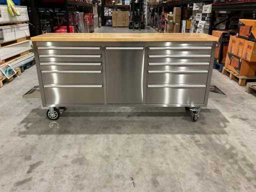Dotato di 11 cassetti; piano da lavoro in legno; chiusura centrale; ruote pesanti; Inutilizzati