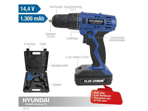 • Impugnatura morbida • Luce da lavoro a LED • Custodia in plastica - Modello: 56112 - EAN: 8718502561128 - Tensione: 14,4 V - Velocità (senza carico): 0-700 min-1 - Tipo di mandrino: rilascio rapido (cambio rapido di trapani o punte) - Capacità del mandrino: 0,8-10 mm - Capacità di perforazione in acciaio: 10 mm - Capacità di perforazione nel legno: 19 mm - Diametro del trapano/punta max.: 10 mm Ø - Impostazioni di coppia: 17+1 - Luce da lavoro LED: sì - Tipo di batteria: Li-ion - Capacità batteria: 1.300 mAh - Tempo di ricarica della batteria: 3-5 h - Peso (batteria inclusa): 1,4 kg - Livello di rumore (LwA): 96 dB - Pressione sonora (LpA): 87 dB Nel pacchetto; - Trapano senza filo Hyundai -Caricatore - 6 Esercitazioni - 6 bit - Portabit e case