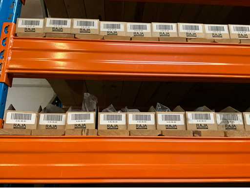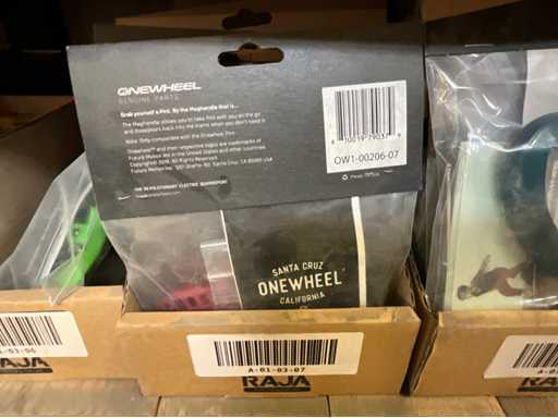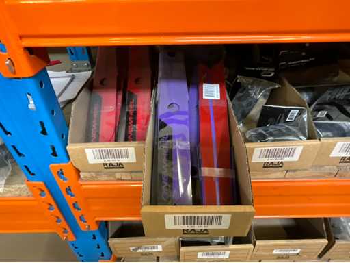 Ricambi vari per scooter elettrici, bici e tavole su 11 scaffali del magazzino imballati in scatole da magazzino Raja
