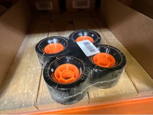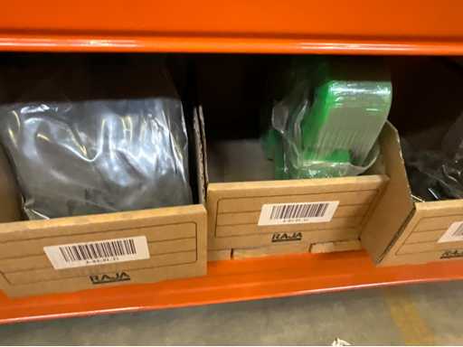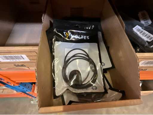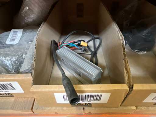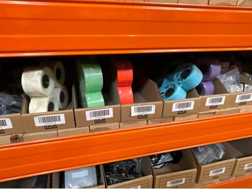 Ricambi vari per scooter elettrici, bici e tavole su 11 scaffali del magazzino imballati in scatole da magazzino Raja