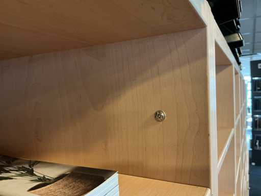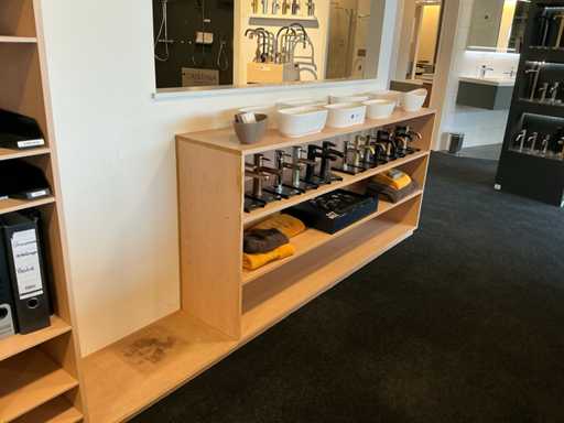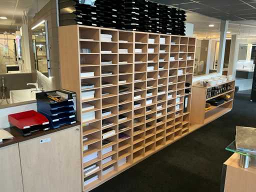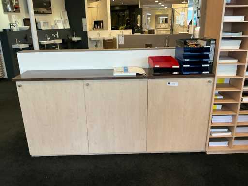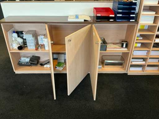 Parte di armadio chiuso (191x37x90cm), parte di armadietto aperto (185x37x90cm), parte di compartimento composta da 3 armadietti collegati (252x37x190cm). Con contenuti composti da forniture per ufficio, contenitori impilati e materiali per opuscoli. Senza i lavandini, i rubinetti e gli accessori igienici distribuiti in modo poco conciso nell'armadietto aperto.
