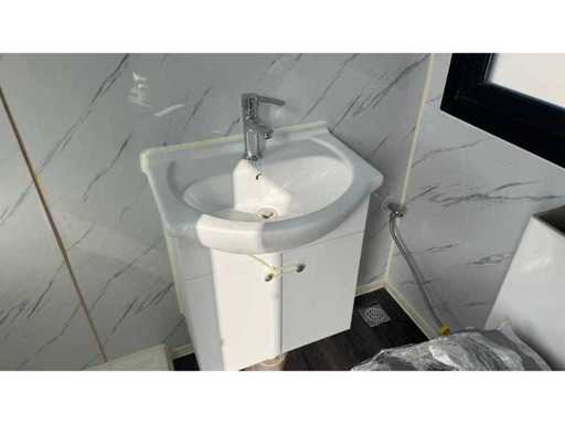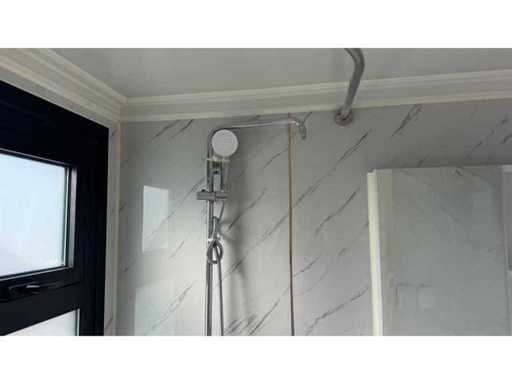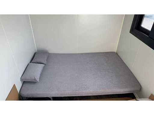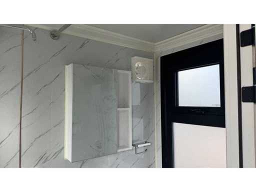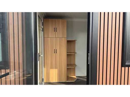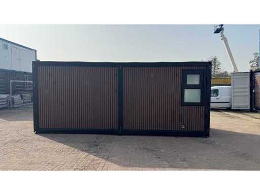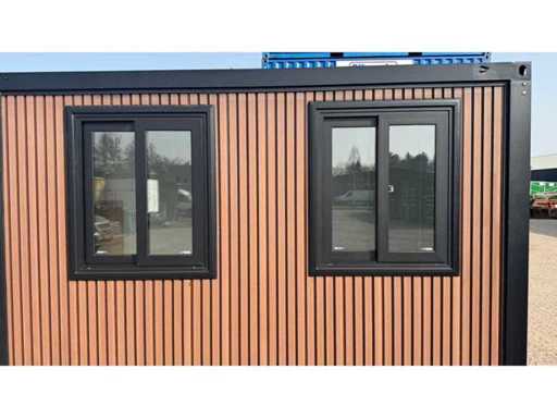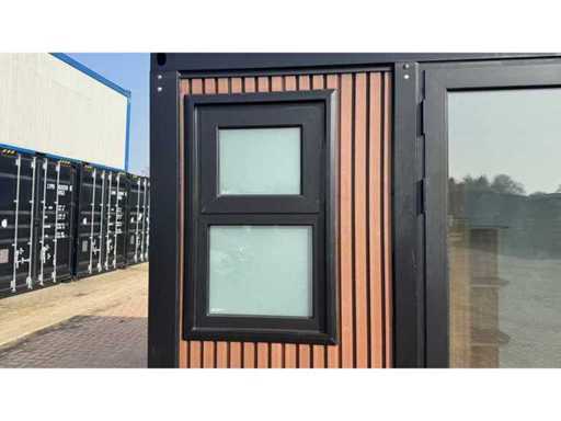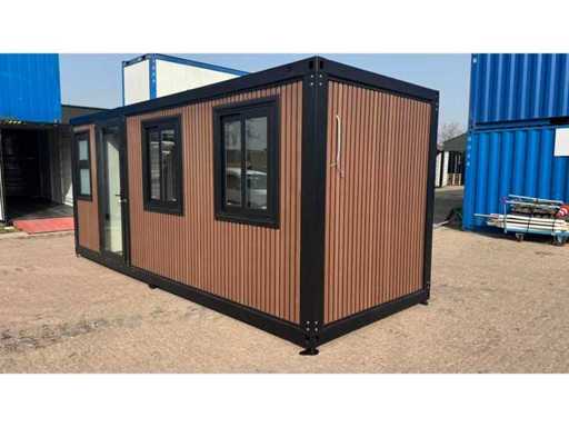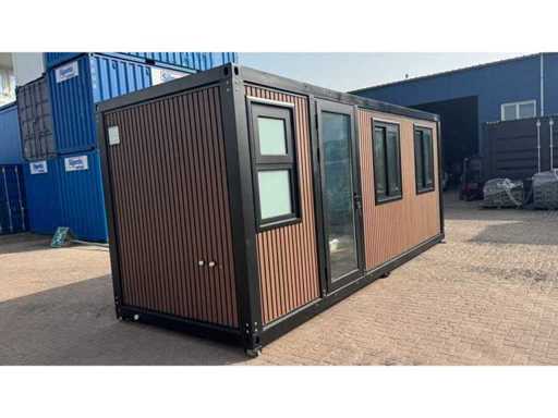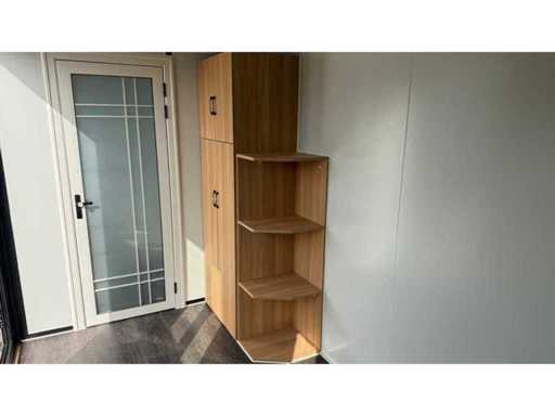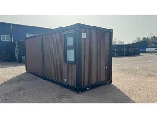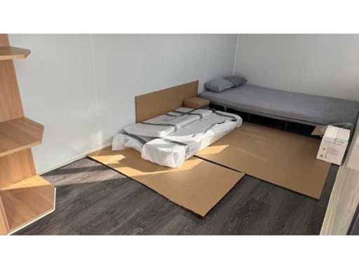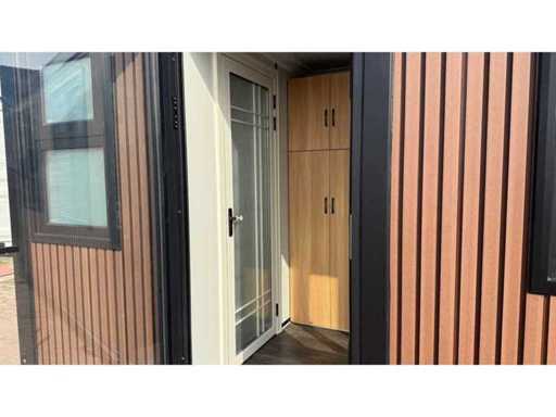 Dotato di rivestimento in legno, bagno, camera da letto con divano letto e armadio, collegamento elettrico 230 Volt, collegamento acqua, fognatura, pavimento in vinile, pianerottolo. Dimensioni di trasporto: 20 ft, (LxAs) 5960x2220x2420 mm