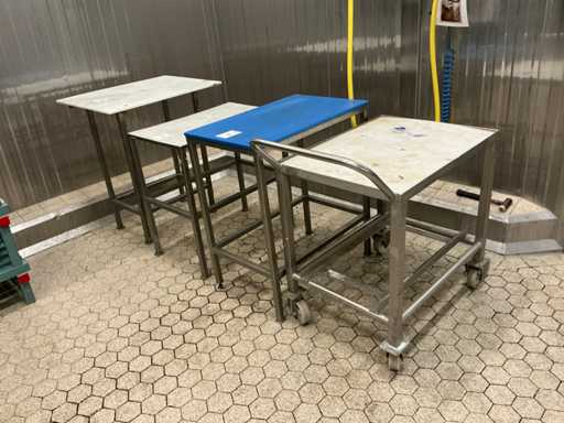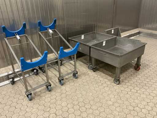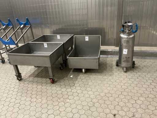 Inclusi 3 portabottiglie in acciaio inossidabile, dimensioni 870x680x1800 mm, 2 portabottiglie in plastica, 4 tavoli, 2 portabottiglie di benzina, 3 lavabole mobile, pulitore per bottiglie e 2 portasacchetti