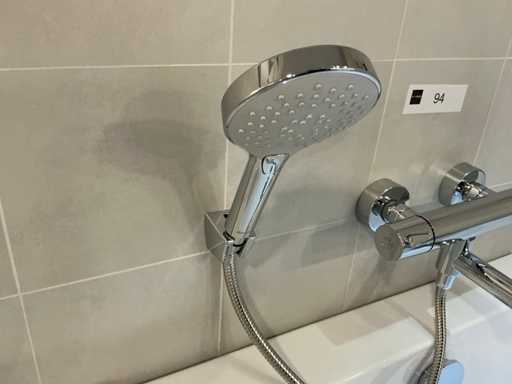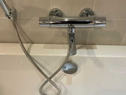 Dotato di doccia a mano, tubo doccia a stecca e rubinetto termostatico in stile Damixa Silhouet, senza parte integrata.