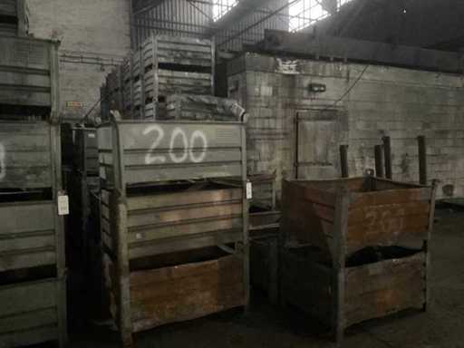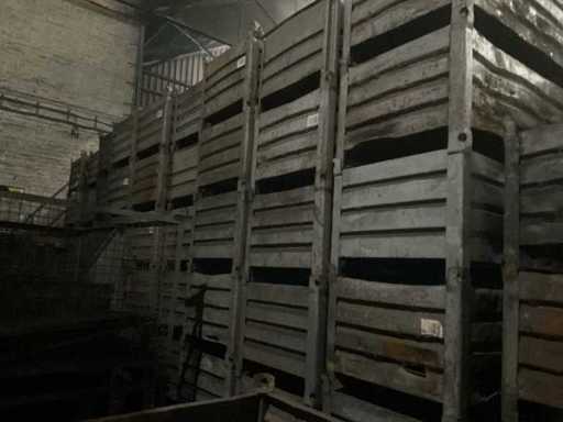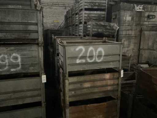 2 file di pile di contenitori per materiali e gitterbox, impilabili, di varie dimensioni e tipi.