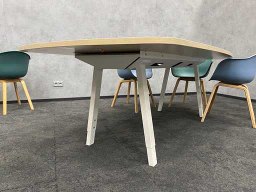 lotto composto da un tavolo in design Vitra Joyn con nuovo piano in stile quercia melamina e telaio in acciaio bianco regolabile in altezza. ---- sedia a secchio 8x con base in legno e guscio di plastica nei colori blu e verde
