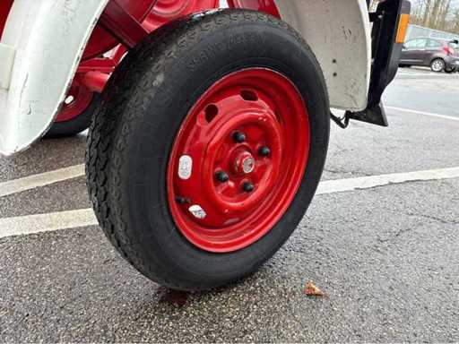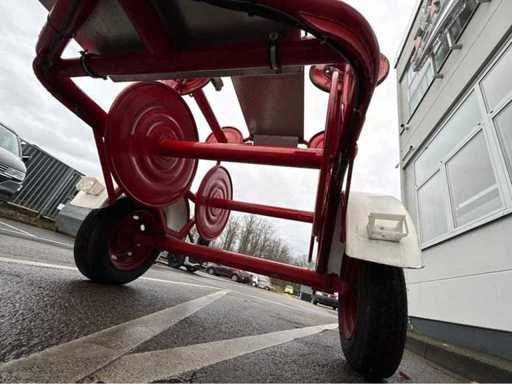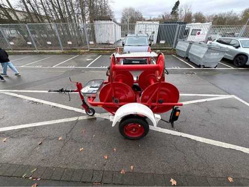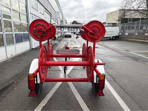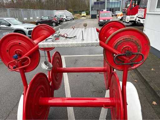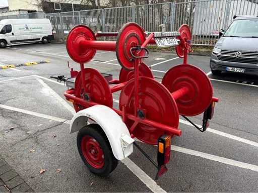 Einachsiger Feuerwehr-Schlauchhaspelanhänger BSA 52/L B32, Baujahr 1985. Bestückt mit 6 großen Haspeln. Lackierung feuerrot, Standfest durch Stützrad, funktionsfähige Zugöse. Ideal für Feuerwehrtechnik-Sammler, Vereine oder als funktionale Reserve.