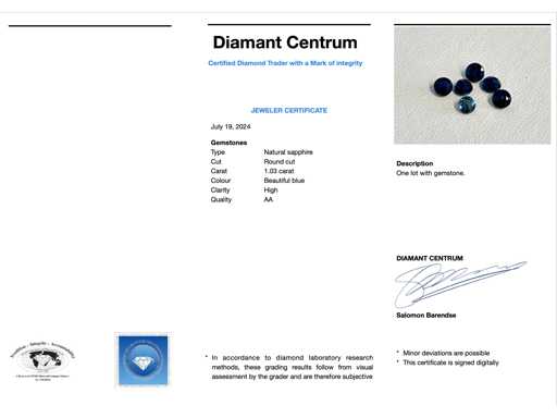 carati Gemma: Zaffiro; Taglio: Taglio rotondo; Peso (carato): 1,03 carati; Colore: Bellissimo blu; Purezza: Alta purezza; Voto: AA; Condizione: Nuova; Imballaggio: Scatola delle Gemme; Spiegazione: La qualità è stata presa dal rapporto relativo all'articolo. La valutazione è una valutazione di un commerciante certificato di diamanti, basata sui prezzi al consumatore; Prezzo al consumo: € 1.180