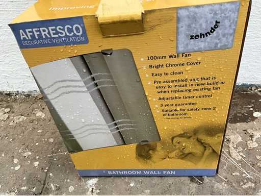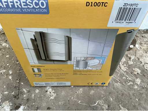 Marca / Tipo: Zehnder Affresco D100TC - Diametro: 100 mm - Potenza: 20 W - Tensione: 230 V / 50 Hz - Capacità: circa 99 m³/h (28 l/s) - Dimensioni della piastra frontale: 180 x 180 mm - Versione: D100TC "Wave" con piastra di copertura cromata trasparente - Funzione: Ventilatore con timer di regolazione (regolabile da 2 a 30 min) - Utilizzo: Montaggio a parete (attraverso la parete o il soffitto) - Zona: Adatto per la zona di sicurezza 2 del bagno