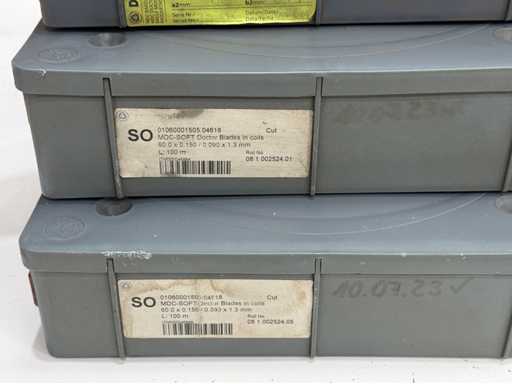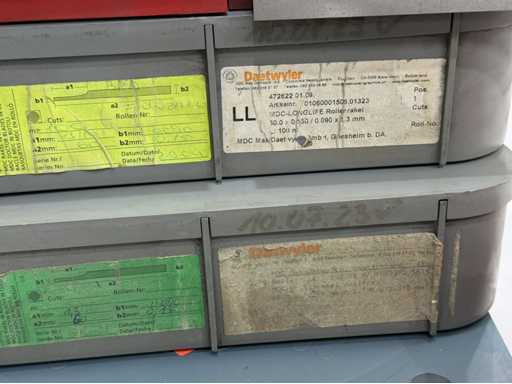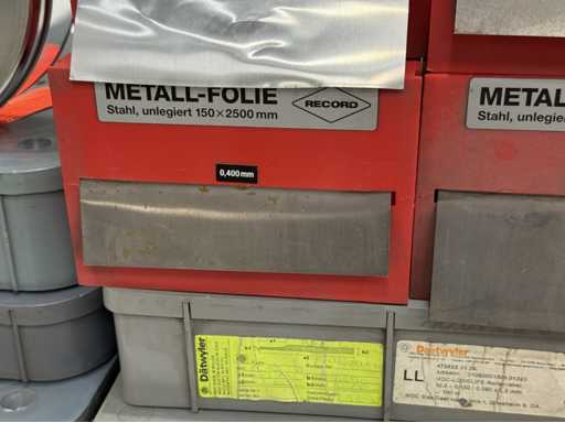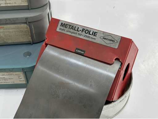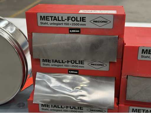 Een grote verzameling metalen folies in verschillende breedtes en diktes; voor meer details, zie foto's van naamborden