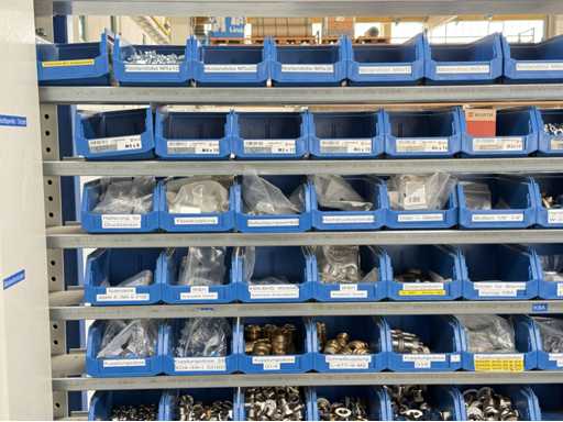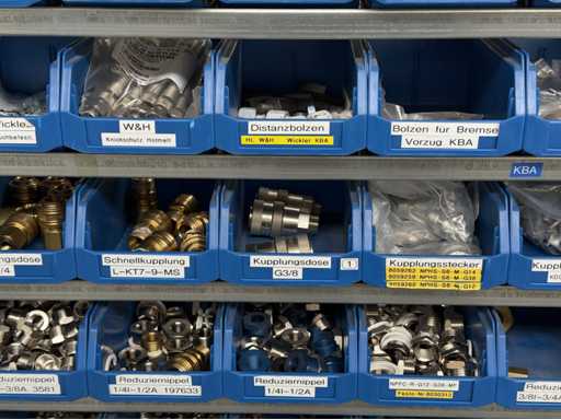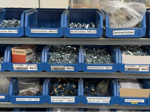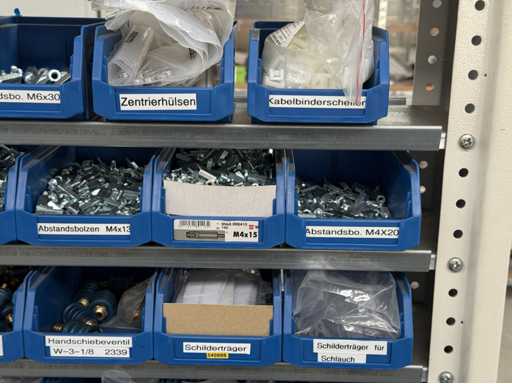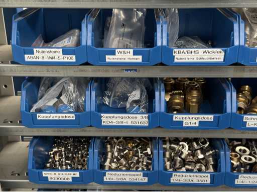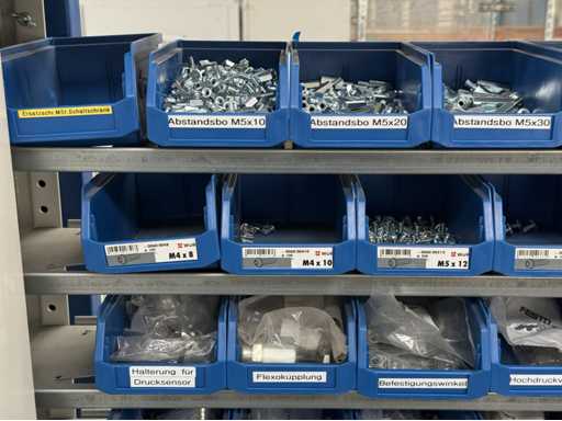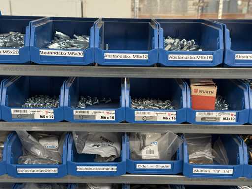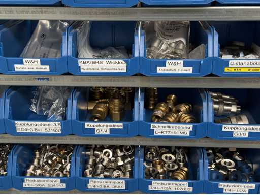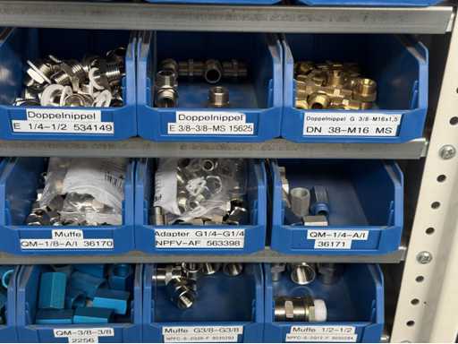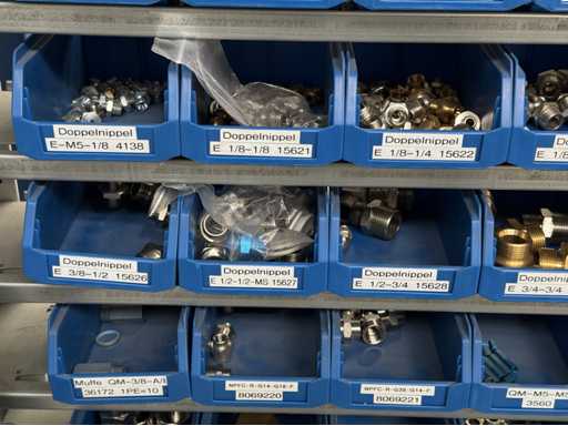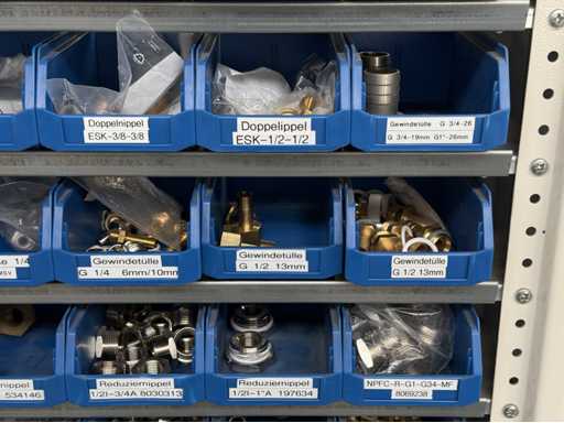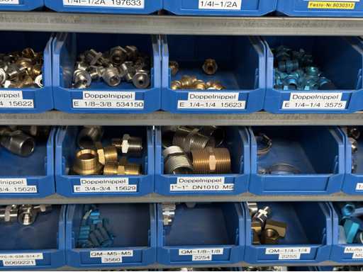 Werkplaatsplank met assortiment montagematerialen: afstandhoudersbouten, handkleppen, reductie-nippels, mouwen, koppelpluggen, voor meer details zie foto's van de naamplaatjes