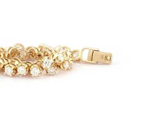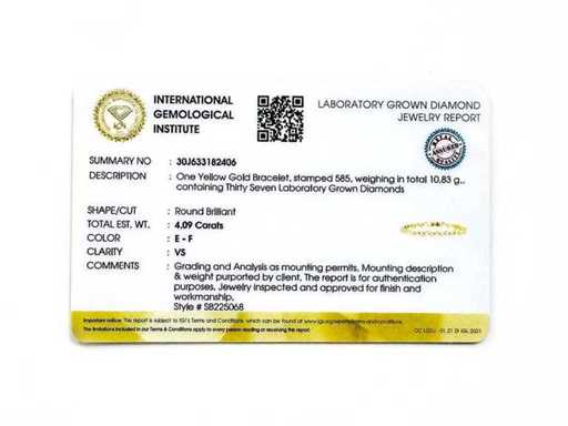 Aantal items-1, metaal-goud, totaal bruto gewicht: 10,83, Gezet met laboratoriumgekweekte diamant, Aantal diamanten: 37, Totaal karaatgewicht: 4,09, Diamanten helderheid: VS, Diamantvorm/slijpvorm: Ronde briljant, Diamanten Kleur: EF, Conditie: Nieuw, Maat-18 cm, Goudzuiverheidskeurmerk op het sieradenartikel, Designcode: 2793-SB225068, Verpakking: Sieradendoos, IGI-certificaat inbegrepen, Historische winkelprijs: €6245, Al onze partijen worden in Fedex-dozen verzonden via hoge prioriteit. Het wordt meestal binnen 7-14 dagen verzonden en de levering gebeurt daarna binnen 24-48 uur. De kavels zijn verzekerd en vooruitbetaald door de verkoper.