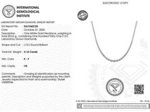 Number Of Items-1, Metal-Gold, Total Gross Weight- 20.63, Set With-Lab Grown Diamond, Number Of Diamonds : 131, Total Carat Weight: 5.16, Diamonds Clarity: VS, Diamonds Shape/Cut : Round Brilliant cut, Diamonds Colour: EF, Condition : New, Size-22 CM, Gold Purity Hallmark On The Item Of Jewellery, Design Code : 10397-LN000944, Packaging : Jewellery Box, IGI Certificate included, Historical Retail Price: €5700, All our lots are shipped in Fedex boxes by high priority. It is despatched in 7-14 days usually and delivery is done in 24-48 hours thereafter. The lots are insured and prepaid by the seller.