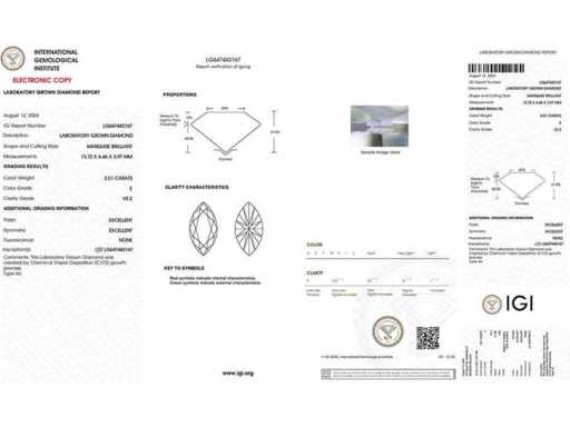 Aantal items-1, metaal-goud, totaal bruto gewicht: 3,72, Gezet met laboratoriumgekweekte diamant, Aantal diamanten: 1, Totaal karaatgewicht: 2,01, Diamanten helderheid: VS2, Diamantvorm/slijpvorm: Marquise Brilliant, Diamanten Kleur: E, Conditie: Nieuw, Maat-EU-54, US-7, VK-N1/2 (Diameter-17,2mm), Goudzuiverheidskeurmerk op het sieradenartikel, Designcode: 8527-SR007621, Verpakking: Sieradendoos, IGI-certificaat inbegrepen, Historische winkelprijs: €3745, Al onze partijen worden in Fedex-dozen verzonden via High Priority. Het wordt meestal binnen 7-14 dagen verzonden en de levering gebeurt daarna binnen 24-48 uur. De kavels zijn verzekerd en vooruitbetaald door de verkoper.