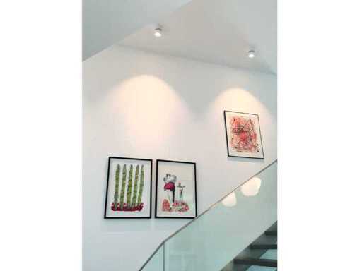 Kantelbare design spots voorzien van knik en draai functie. De spots kunnen recht naar beneden schijnen, maar kunnen vloeiend worden gekanteld zodat ze naar andere kanten van de ruimte zullen schijnen. Geschikt voor in werkkamers, studeerkamers, ontvangstruimten of in gangen, maar ook in de woonkamer, in slaapkamers of aan schuine daken op zolder. Geschikt voor zowel plafond montage of aan wand montage, voorzien een A++ led lichtbron met warm wit licht. Afmeting ca 10 x 10 cm, kantelbaar: ja, roteerbaar: ja, 9 watt COB led. Kleur: wit/goud. Bijzonderheden: Dit product is volledig nieuw, lotwaarde: € 1590, -