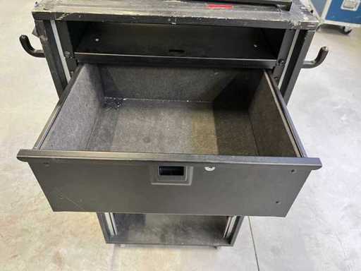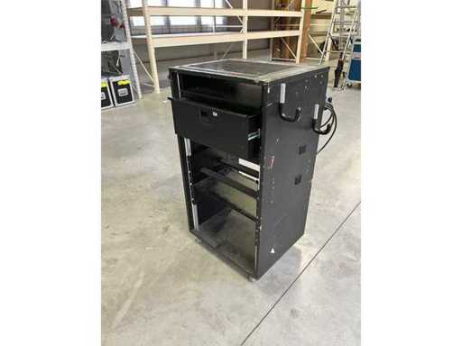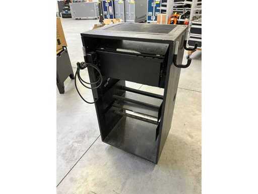 19" houten rackkast, op wielen, inclusief diverse ingebouwde onderdelen zoals