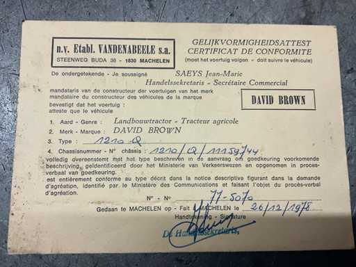 Deze David Brown 1210Q uit 1979 verkeert in nette oldtimerstaat en is voorzien van cabine, nieuwe voorbanden en een werkende 12V stroomvoorziening voor elektrische kipremorken. De tractor start en rijdt en toont een afgelezen urenstand van 7.375 uur.